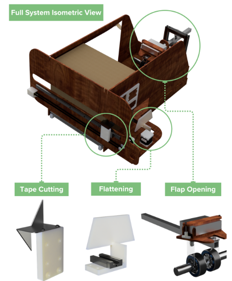 Cardboard packaging is essential in global commerce due to its durability, lightweight nature, and recyclability. In the U.S., about 70% of corrugated cardboard is recycled, but this rate could increase with better practices, such as properly collapsing boxes. Large heaps of un-collapsed cardboard are a common issue, especially in businesses and warehouses where workers often lack the time to break them down efficiently. Current solutions are bulky and destructive.