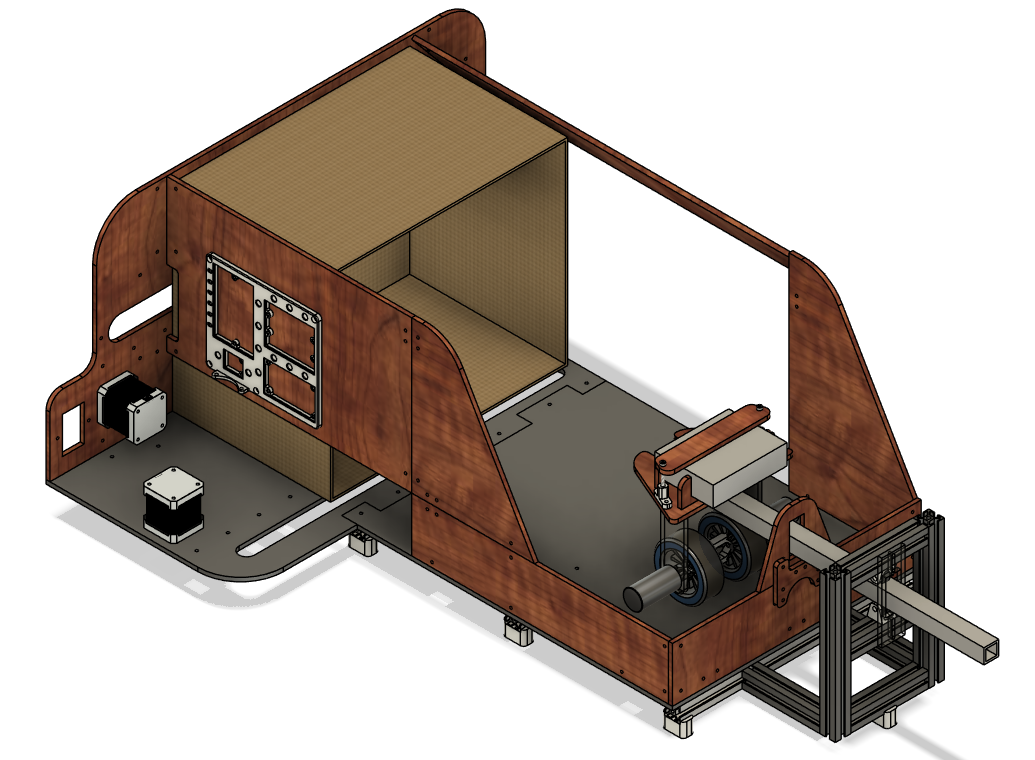 Flap Opening: Two rubber wheels, powered by DC motors, move forward into the box for 5 seconds, with a stopper limiting penetration, then rotate for 1 second to pull the box towards a flap-opening interface. Flaps are opened to at least 50°, and the wheels then reverse for 800ms, pushing the box back and resetting the opener. A weight ensures contact between the wheels and cardboard, and the rod moves smoothly on bearings to account for small height changes.
